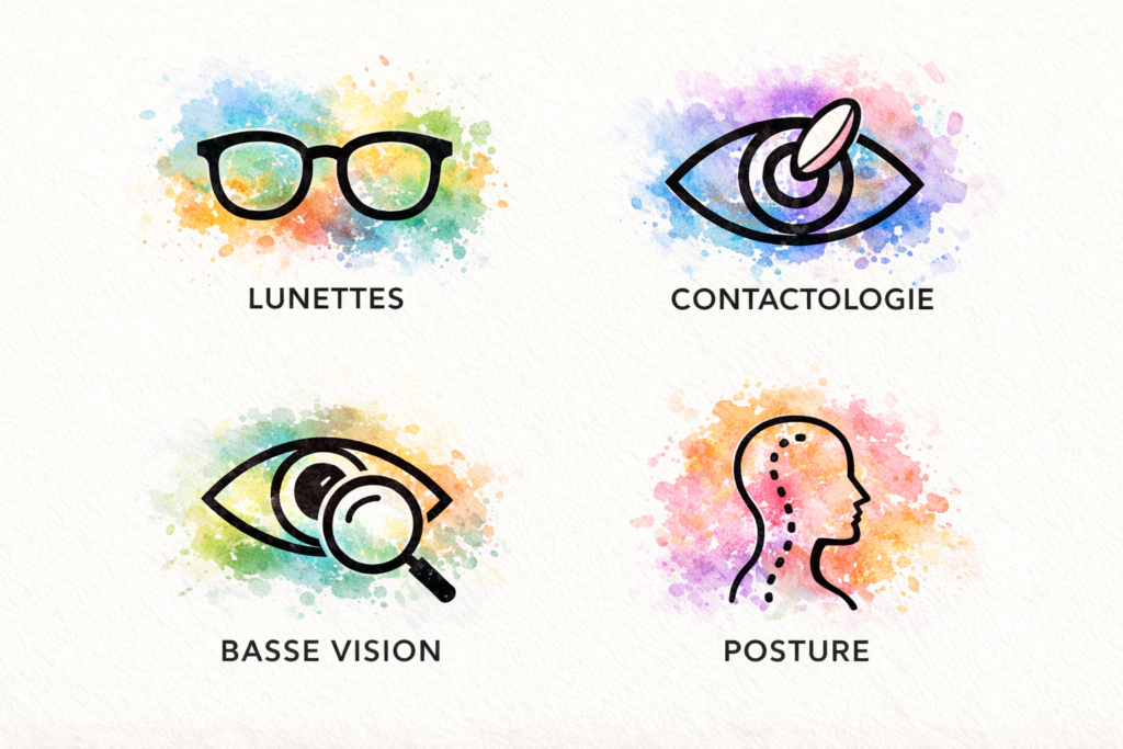 La lunetterie, les examens de la vue, l’adaptation en lentilles de contact sur mesure, la gestion de la sécheresse oculaire et la basse vision : loupes électroniques, vidéo-agrandisseurs, filtres colorés, bilan complet, DMLA…